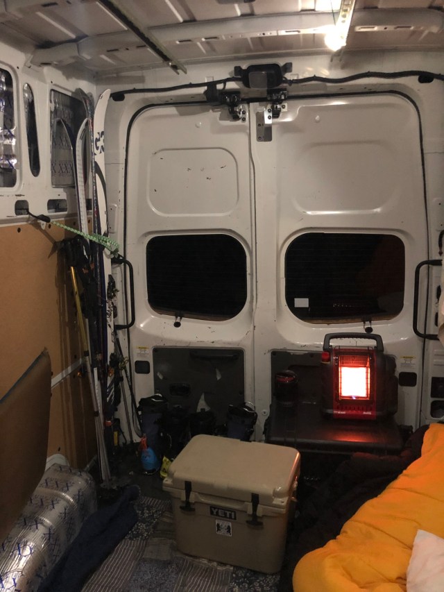 We rolled into a mostly empty parking lot about 10 and left the van running to crank up the heat while we re-packed. J started the Mr. Buddy Heater and the van was toasty. I set up a camp chair and sorted my pack and set my clothes out for a 1:30 wake up.