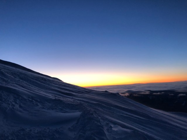 I was a bit worried about carbon monoxide when we had the heater and the MSR Reactor both cranking as we boiled for coffee and oatmeal and changed for the climb. What does a CO overdose feel like… I’m already tired and lightheaded from 3 hours of fitful sleep. Best to wrap it up and get out into the pre dawn air.
