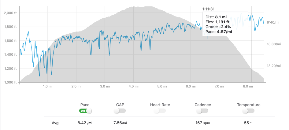 I picked up a pair of Hoka Clifton 5’s to throw into the rotation and see if they would work for longer mixed surface runs. Not saying I’m a fan boy yet – but I’m no longer sore when I wake up in the morning. I did a long 9 mile road/trail on Friday and didn’t feel any residual soreness on Saturday. I took Saturday off and then did a medium/hard (downhill) run on Sunday. I was running downhill fast (around 6:00 pace). And I was thinking my quads were going to be shredded running that hard – but Monday morning – nothing. It’s the Hoka cushioning (I think). I could be just adapting to the increase in mileage, but I really think I’m getting a softer landing.