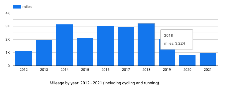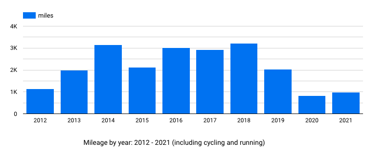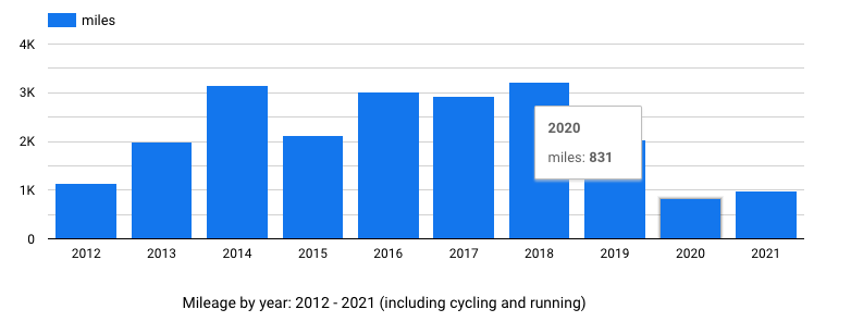 2015 – 2018 were pretty consistent, but I started to fall off the volume in 2019, and nose-dived in 2020. Cloudability had just been acquired acquired and I started going into the office less (no 10 mile round trip bike commute) and less frequent lunch time runs. I think I was just working a lot in 2019 before Covid. I has my last flight to Seattle in March, when Covid started to appear more frequently in the news – I think everything shut down a few weeks later. I can’t believe I was traveling through SeaTac maskless with people coughing all around. Holy shit. I took over leadership of a much larger team in 2019 and was just generally working a lot (remotely). My training volume suffered.