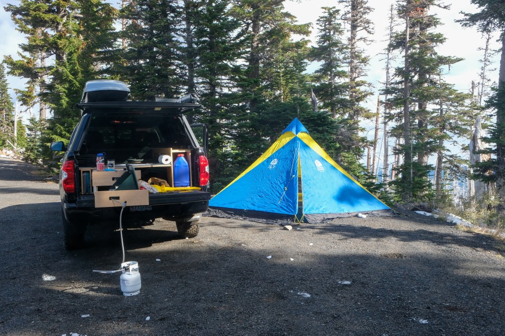 We went up to Cloud Cap for the day to play in the snow, try out the new sled, and get the tarp set up to measure where the stove jack will be sewn in. We’ve used this tarp in the past on winter snowshoe trips as a mobile warming hut – this winter I’ll get the stove inside and hopefully make a few winter overnighters more fun!