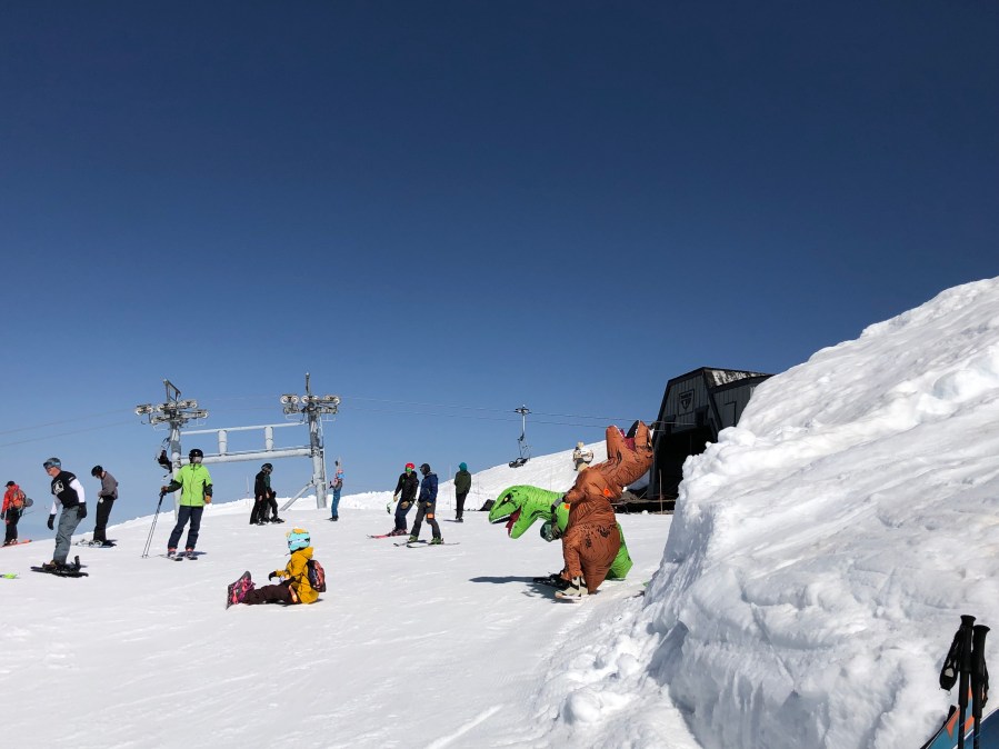 Croissants with strawberry jam, strong coffee, dinosaurs from Japan, and endless corn snow. We camped out Sunday night and got to the mountain early. Great day to be on the mountain and always a treat when the Palmer lift is running.