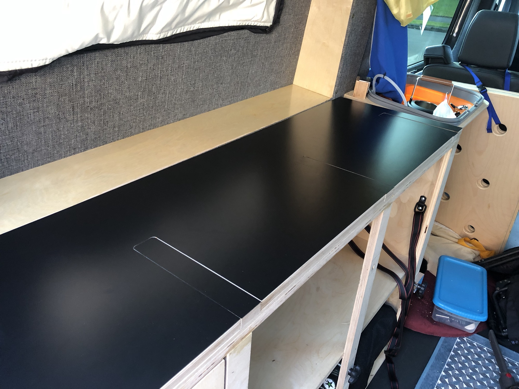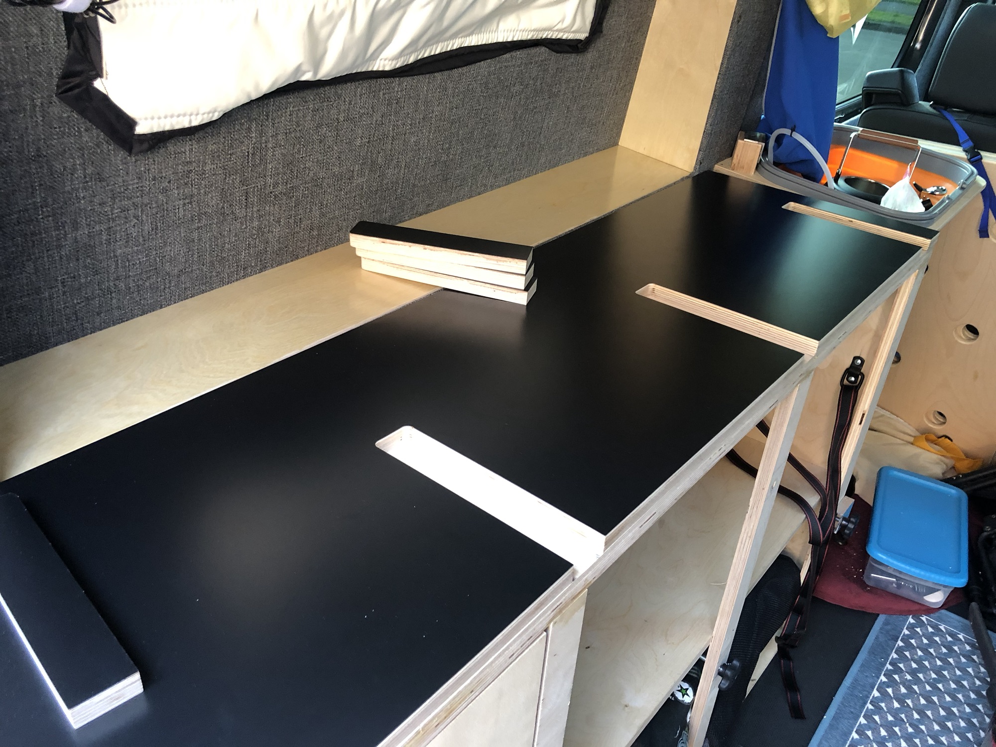 I’m taking a break from the van build, but I did manage to laminate the countertop. I ordered a 4×8 sheet of matte black Formica and replaced the pieced together plywood counter with a single piece of Baltic birch. I template routed the grooves for the bed supports and then laminated the entire countertop using contact cement. Using the bandsaw I cut inserts from the same Birch and laminated them to match. This way with the bed stowed up and away, I have a continuous 60in x 23 in countertop to cook on, do meal prep, or use as a standing desk. It works.