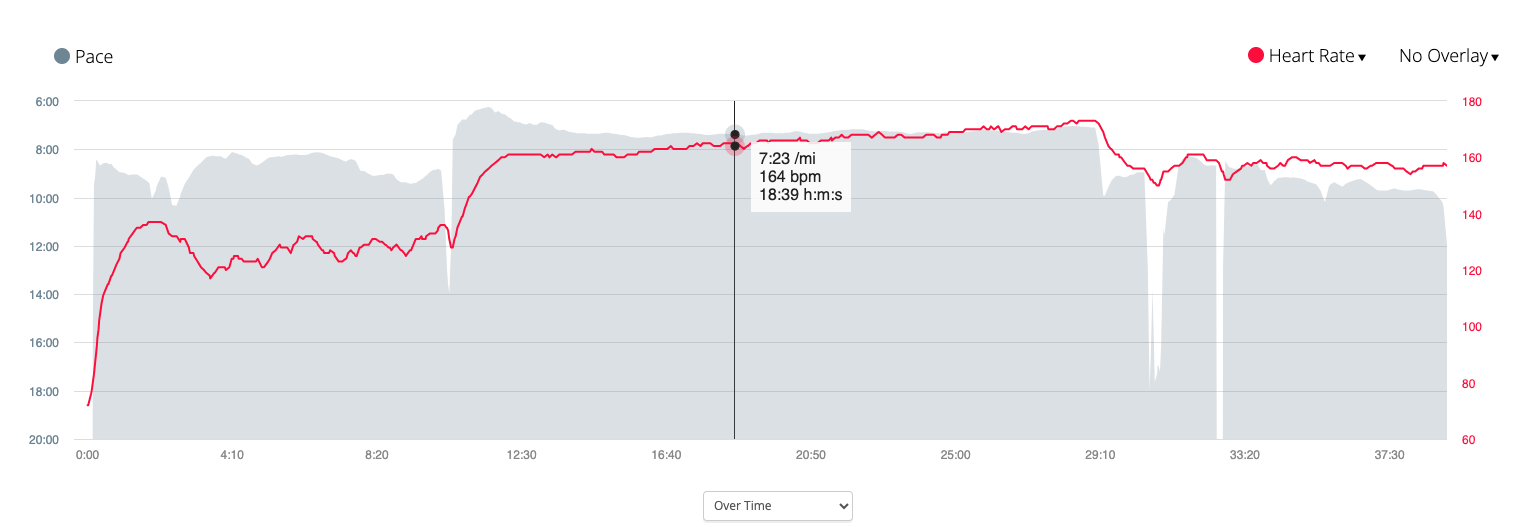 That pace is around 7:40/mile. I’m planning to stick to 7:40-7:50 for the first 5-6 miles, then try to negative split the second half with a pace of around 7:20, and the last 5K at full gas. Based on training the past few weeks, my lactate threshold is around 160 bpm, meaning I can clear lactic acid from my muscles at the same rate it’s produced at that heart rate. Beyond that I only have a few matches to burn before I blow up. The trick is to not blow up until the finish line.
