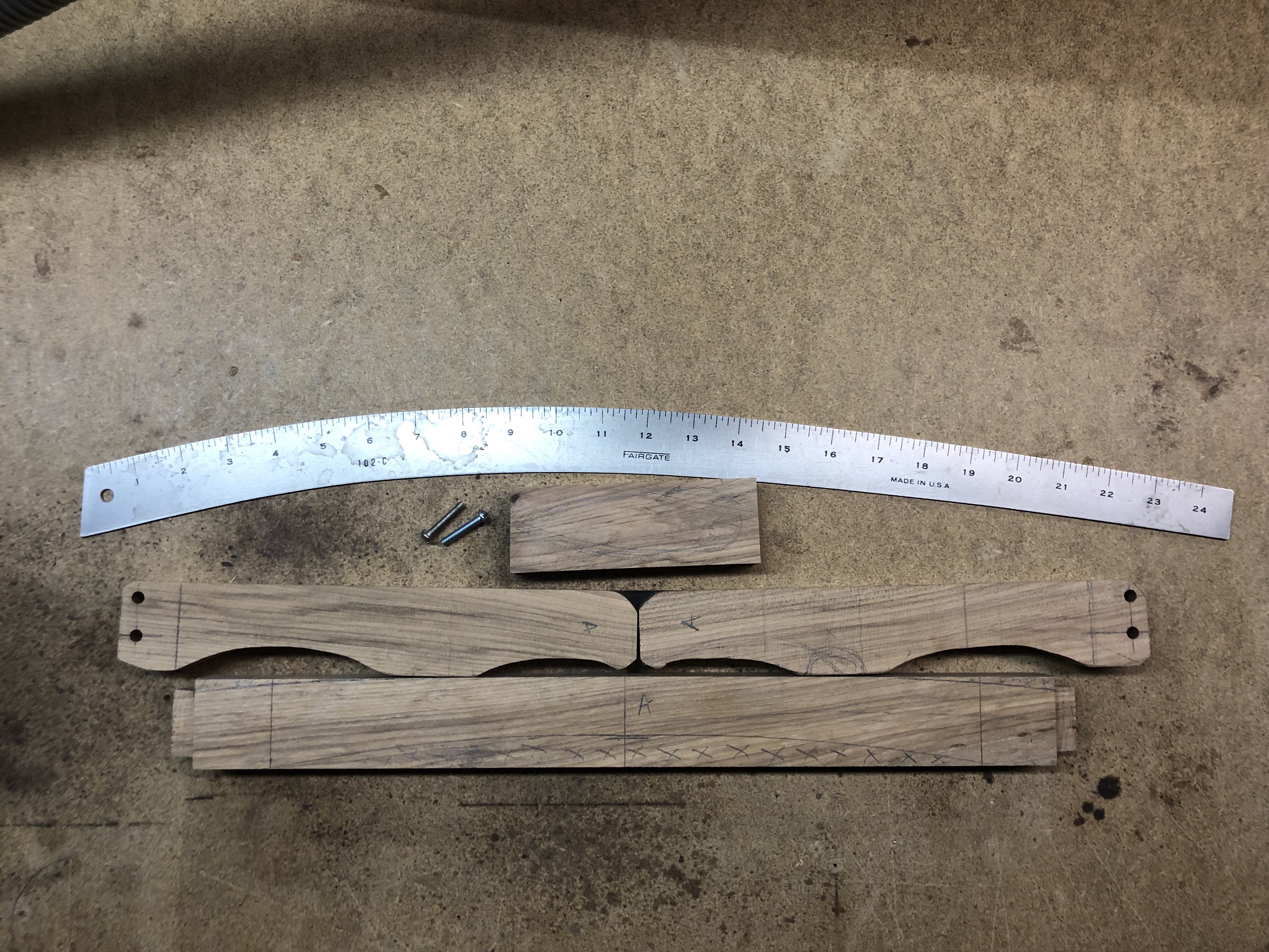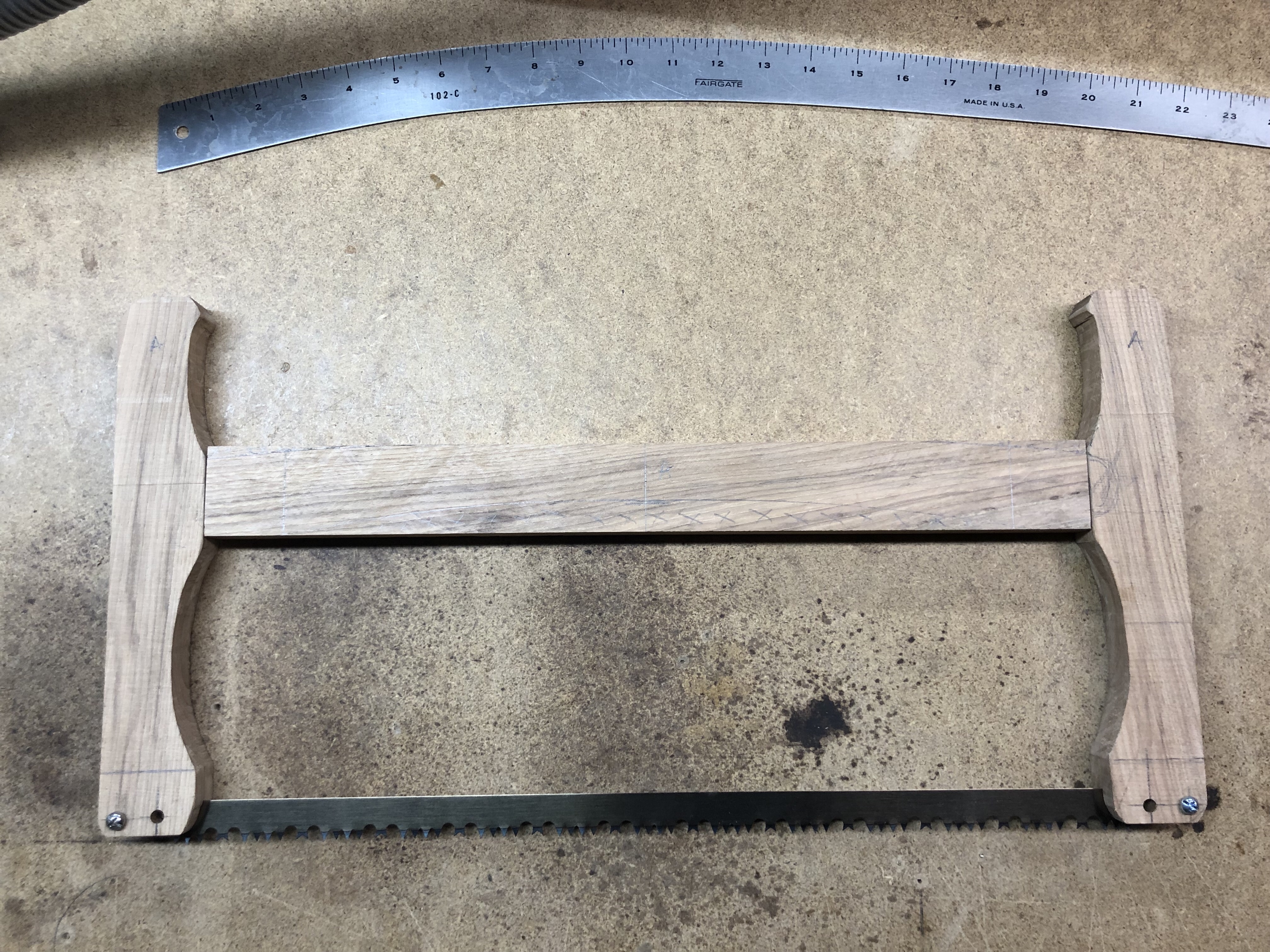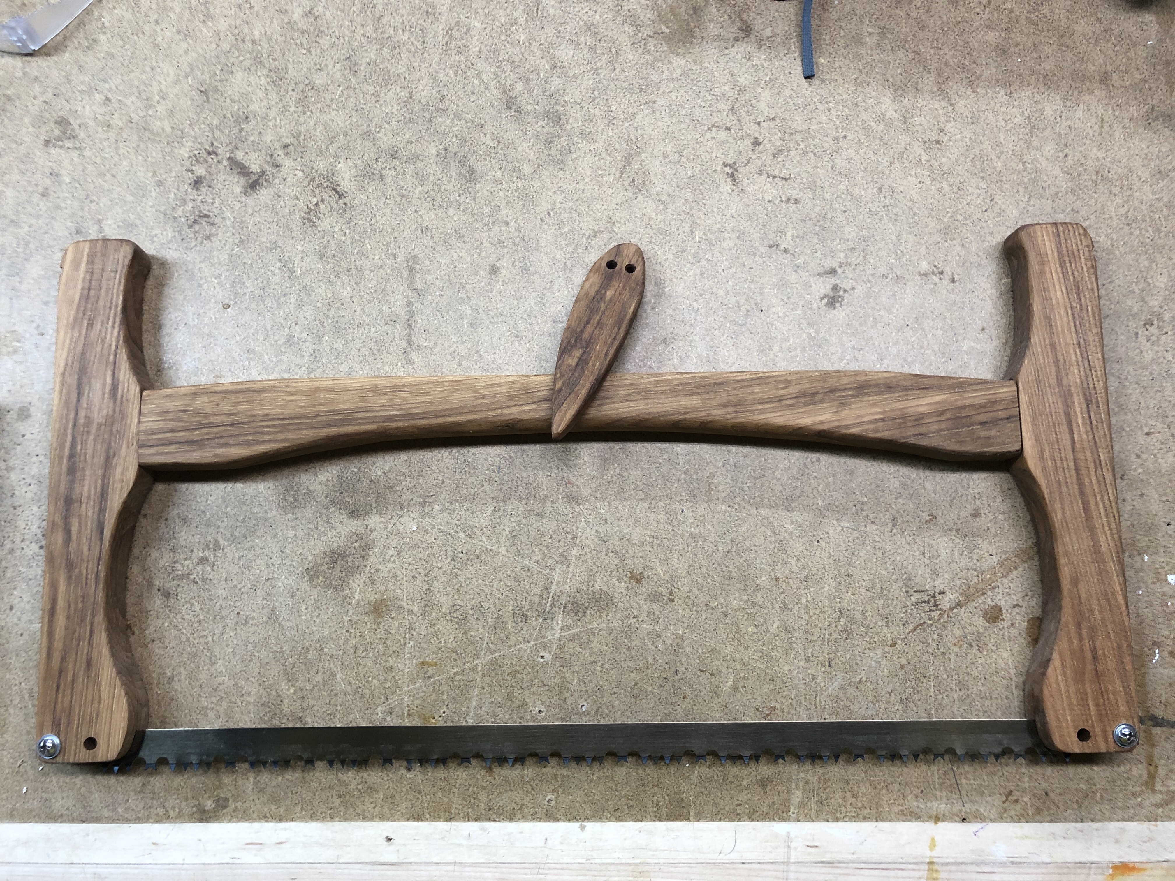 Here’s a folding bow saw (for cutting firewood? I guess?). It’s hickory and finished with boiled linseed oil. The pieces fit together with a mortise and tenon on the long arm and the blade folds into a saw kerf in the handle.