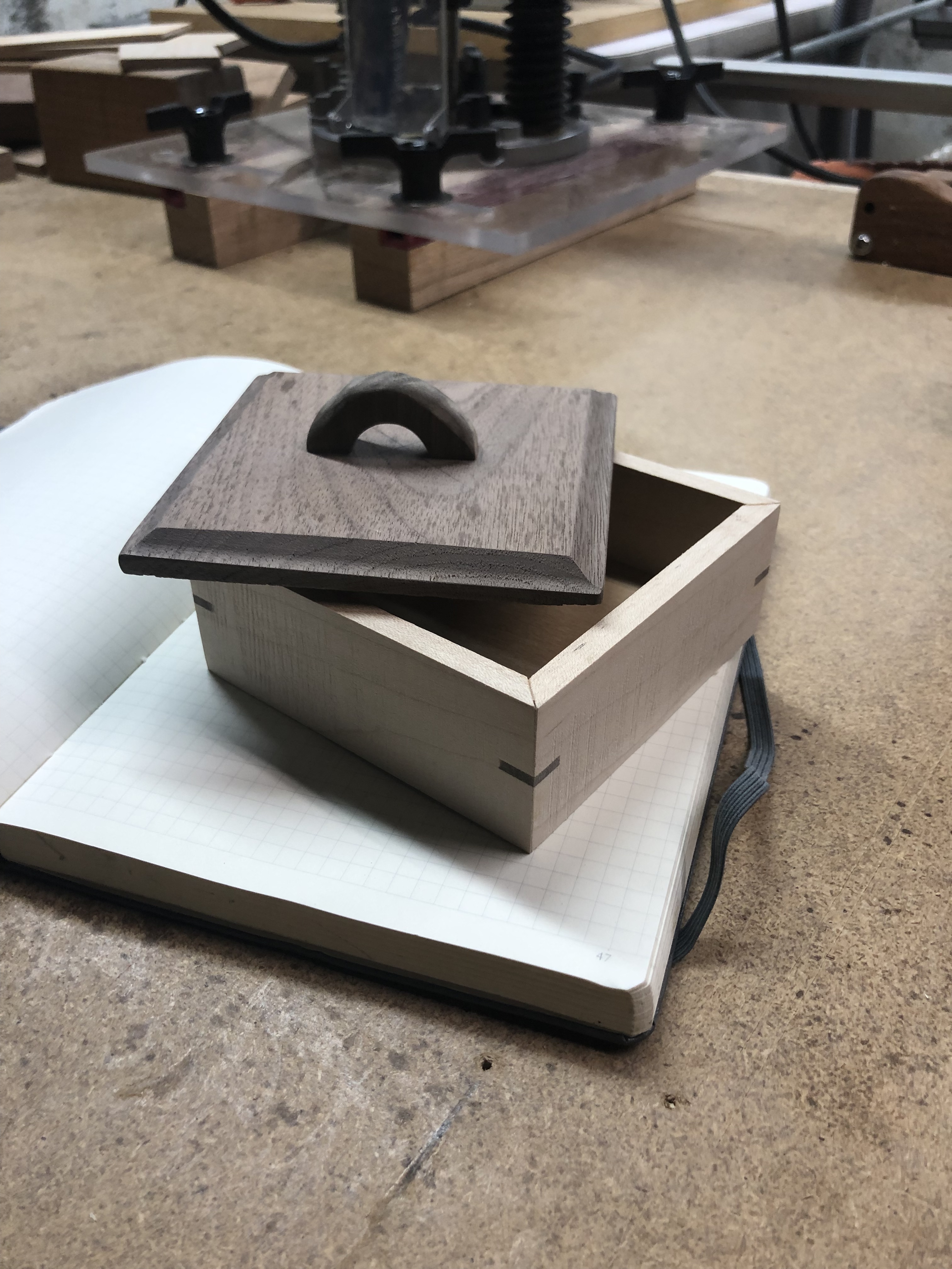 So I made her a small box. Maple milled to 1/4″ on the bandsaw, mitered and then keyed with walnut. Top is walnut with a carved finger pull.