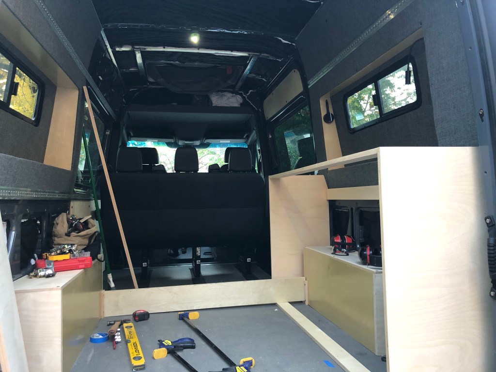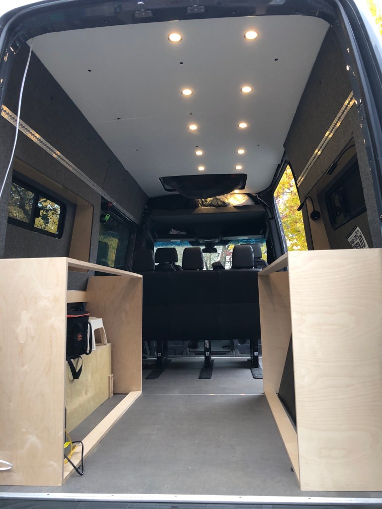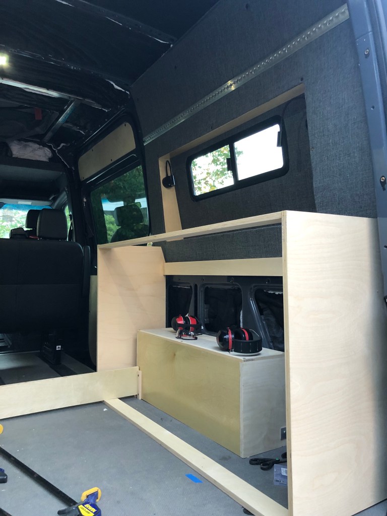 It’s been a productive few weeks in the shop. The upper cabinets are in, mattress is back in and stowed with the folding bed. Lights are now on separate circuits with dimmer switches on each.