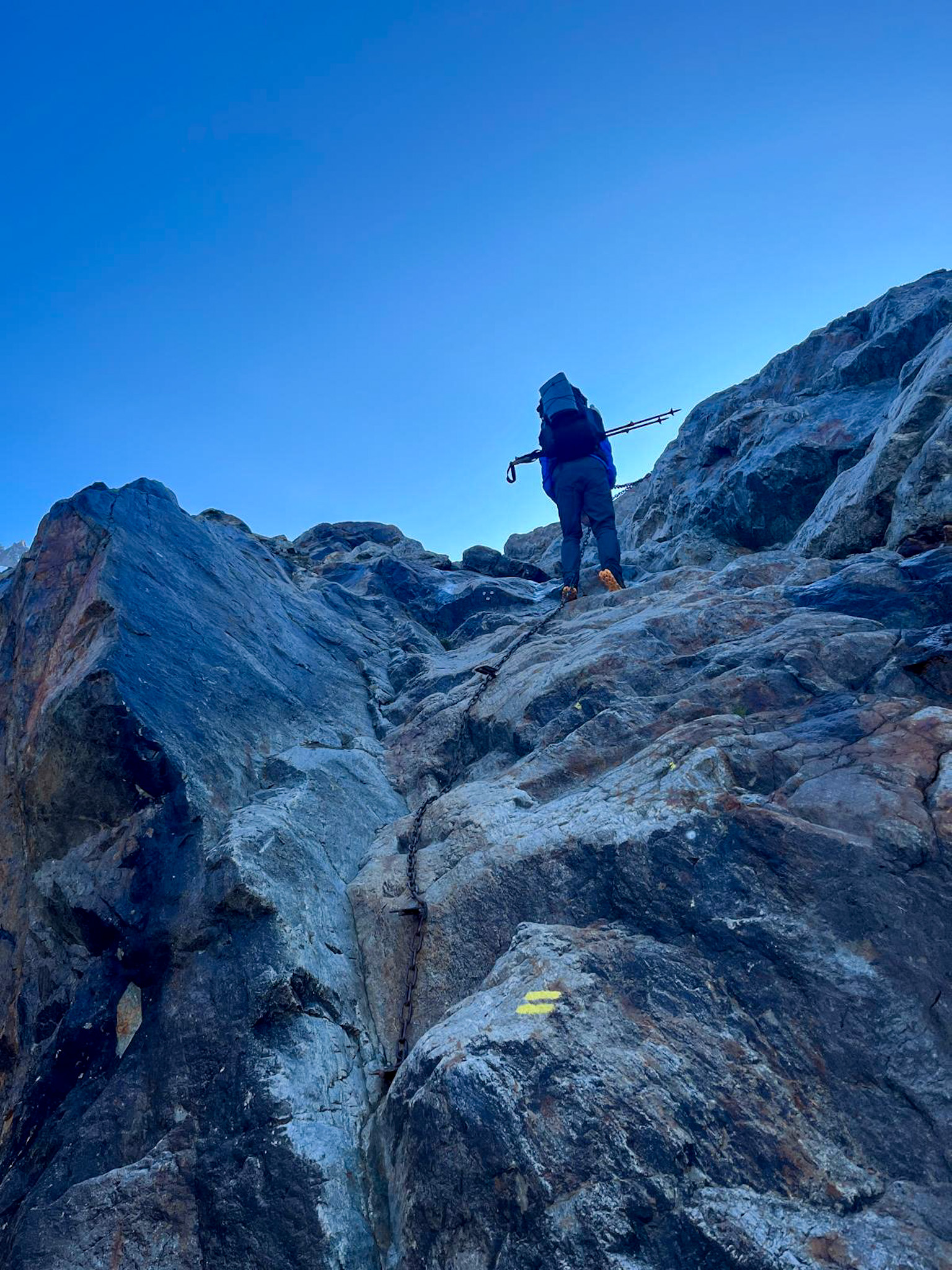 The next morning dawned with broken clouds and views of the snow capped 10k foot peaks south of the Mont Blanc massif. We were on the trail just after 7 and scrambled in the shade across the canyons carved by the retreating glacier. In my research I knew this section would be challenging – some sections of trail consisted of chains and steel steps anchored into the rock. It was enjoyable scrambling and we soon rounded a buttress into the sun where I stopped to apply sun cream and change into a sun hoody.
