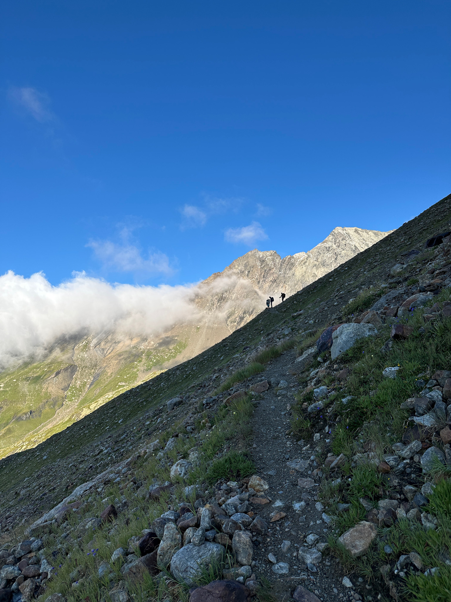 We were approaching a steep wall of a 500-600 feet and weren’t sure how we were going to ascend it – there didn’t seem to be an obvious path to the top. Col de la Seigne was at the crest and then we would begin the long walk down Val Veny toward Courmayeur.