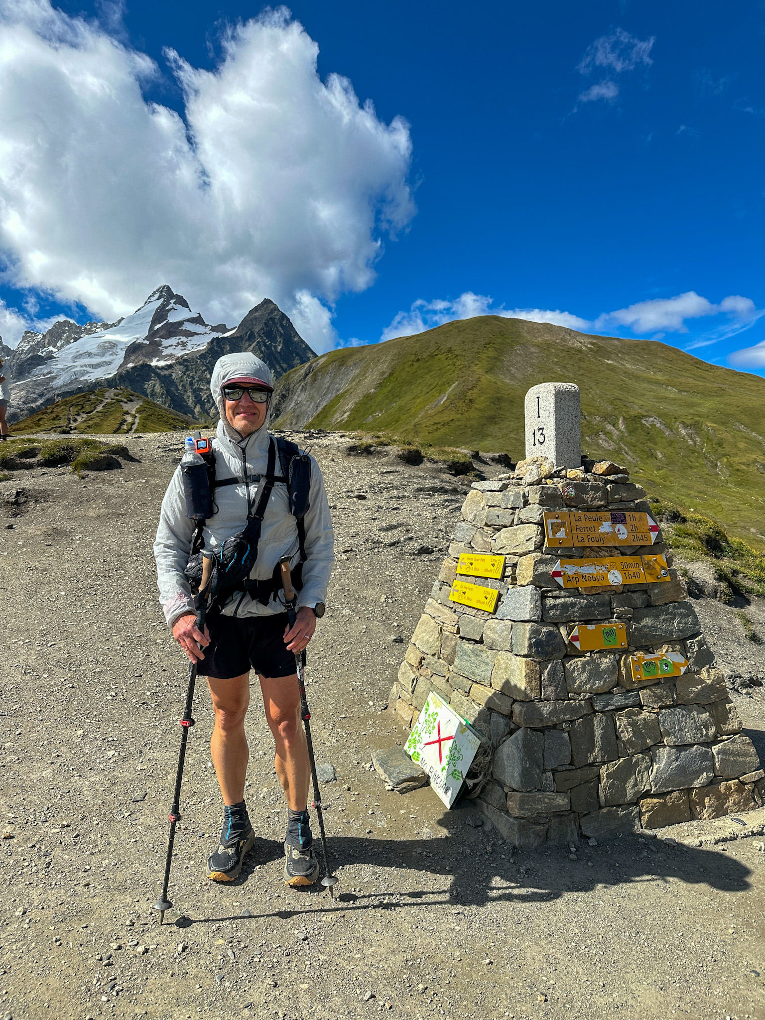 It was day 4 of my Tour du Mont Blanc and I left Camping Grand Jorasses campground in Courmayeur at 6:30 and looped back to Rifugio Bertone on the main TMB route, and then climbed up Mont de la Saxe toward Col Sapin. This was the only section of trail that I backtracked, but I wanted to get up on the ridge to look across at the Mont Blanc massif. I had been leapfrogging a family (dad, 2 sons and daughter) most of the day and we had just begun the climb from Rifugio Elena up Grand Col Ferret. It was windy and I had my buff over my ears and windbreaker zipped up to trap in some warmth. This is the pass where the TMB crosses into Switzerland and is followed by a long descent to La Fouly where I would camp for the night.