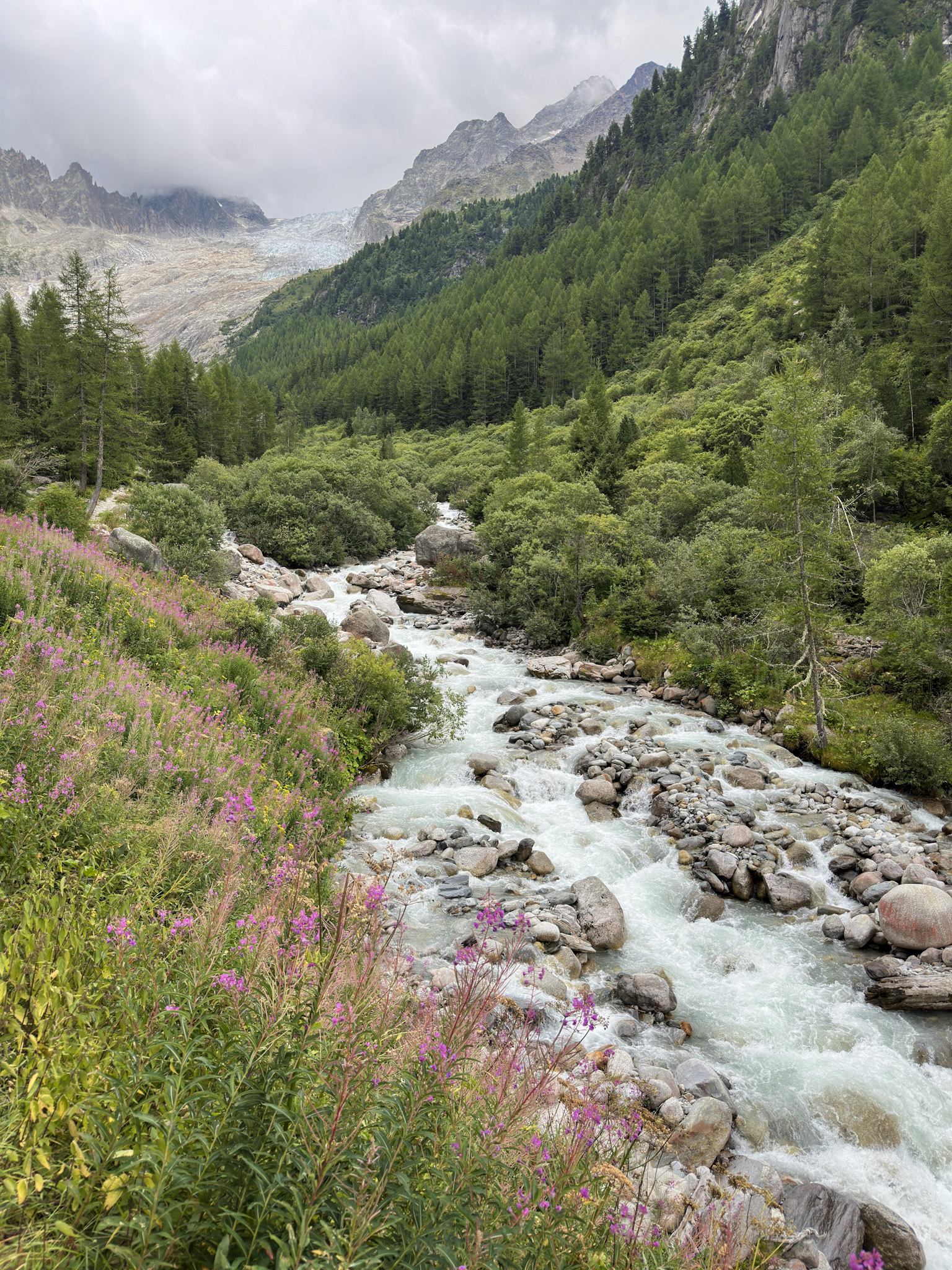 Fenetre d’Arpette is a pass on the high route of the TMB, an alternate to the main route. The climb started gently up a meandering creek and through fields of wildflowers, then traversed a scree slope before pointing straight up to the col where it becomes a scramble over large boulders following the red and white Swiss trail markers. I stashed my trekking poles on my pack and began to climb. The final few hundred feet consisted of a series of steep switchbacks over loose stones. The weather was good and I didn’t have the same concerns as crossing Col d’Enclave 2 days earlier. The views from the top were stunning of the retreating glacier across Plateau de Trient. If there is one theme of this trip – it’s the evidence of climate change and the retreating glaciers. Sadly, I was glad to see this part of the world before the glaciers are gone forever.