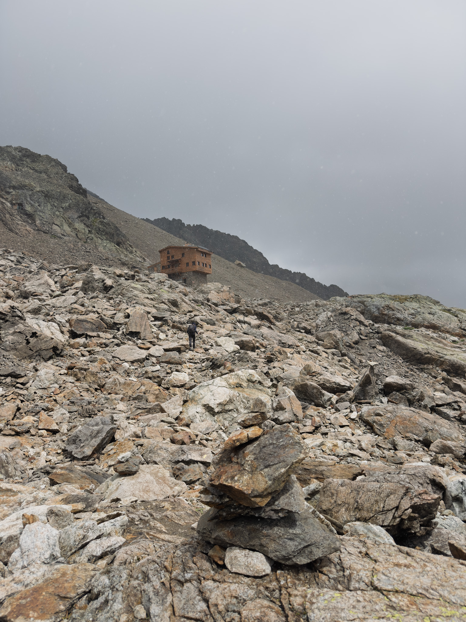 Col d’Enclave is a steep scramble that begins from Lac Jovet and gets steeper and steeper as you get closer to the col. It begins by climbing from the lake up a scree slope, then turns into a scramble following cairns up to the ridge. Halfway up the rain turned to snow and thick clouds were blowing over the ridgetop. I had all my rain gear on and my poles stashed. At this point we weren’t retreating. I checked Gaia and saw that we only had about 600 more feet to the top. We agreed to continue and take it carefully and slowly. Following a short celebration we dropped into the valley and stopped for a short break on the lee side of boulder.