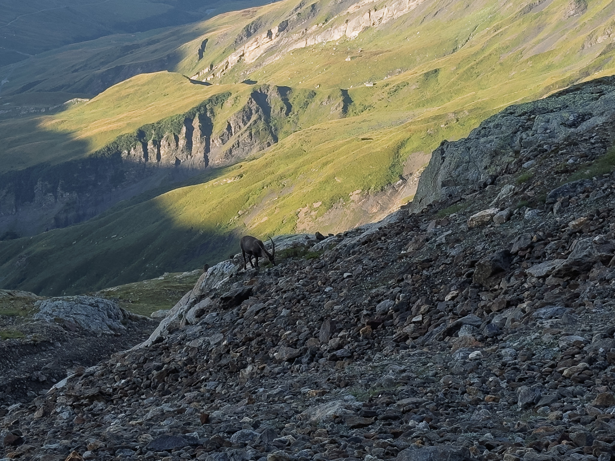 We made good time traversing to the 2nd col we needed to cross, Col de la Grande Ecaille. This consisted of a steep decomposed shale slope and black mud. More slippery than anything. Once surmounted, we got our first glimpse of Refuge Robert Blanc across the valley.